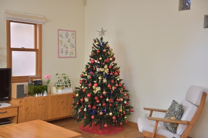 ▼高さ180㎝のツリー。20年近く飾っていますがまだ葉っぱも落ちず綺麗ですよ~