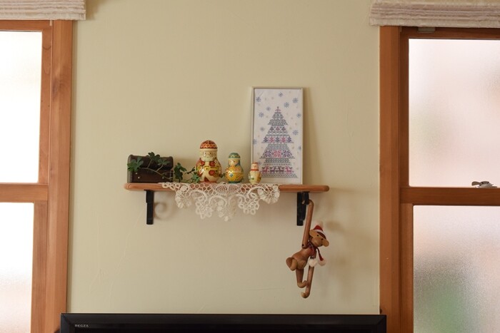 テレビの上にはお友達のロシア土産のマトリョーシカと、私が昔作ったクロスステッチのツリーを飾りました。
