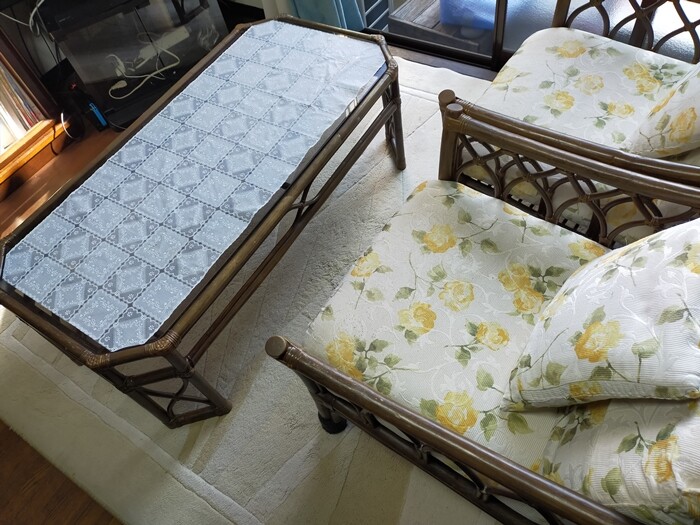 そして、リビングの籐のテーブルの天板のガラスをどけて…(テーブルの上にもいっぱいモノが載っていました)。