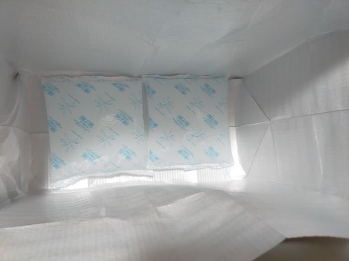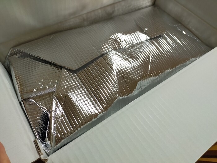 よく食べる大人が5人なので、大人数用のものだとよいな~と思っていたので、7~8人前が当たって嬉しい✨しっかりと保冷のアルミ袋に入っていまして。
