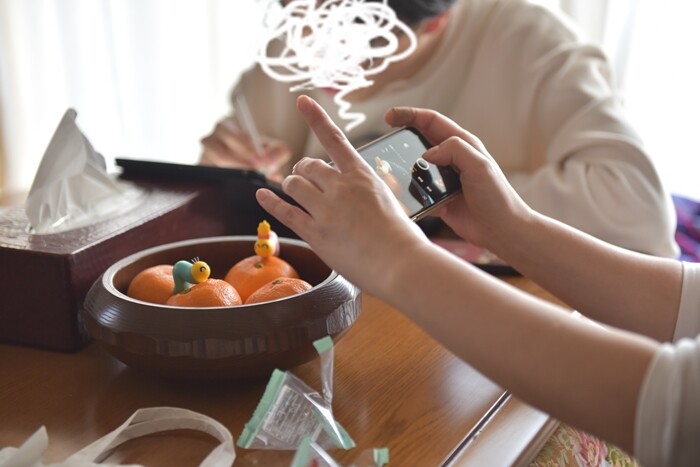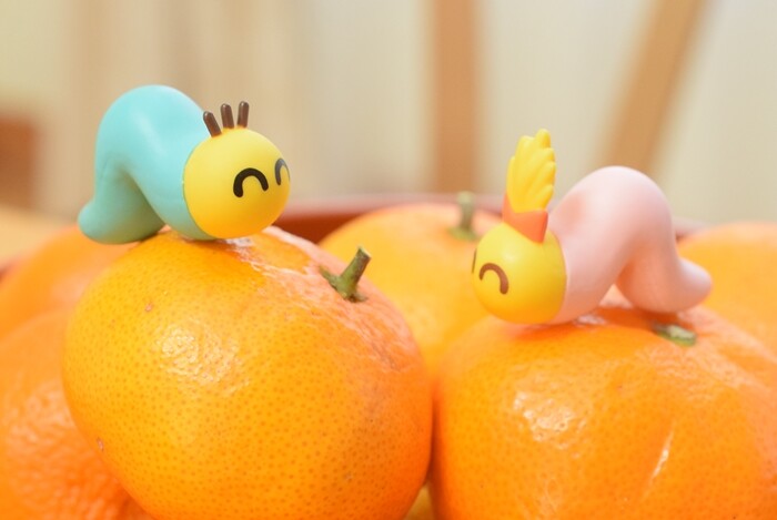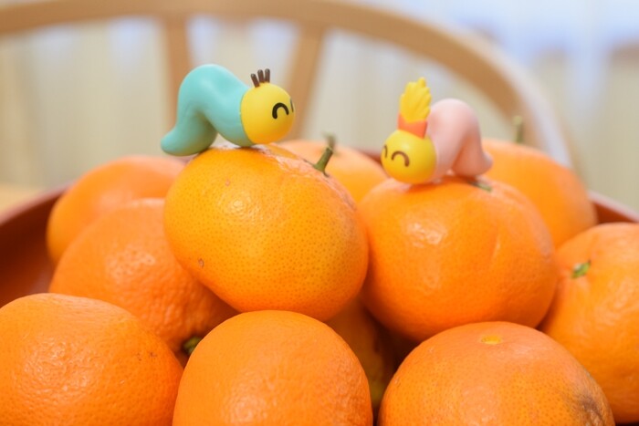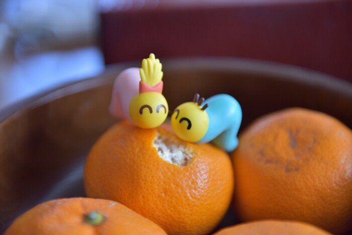 山梨にいるときにコタツでみかんにのせて撮影(笑)↓奥にいるのは息子。