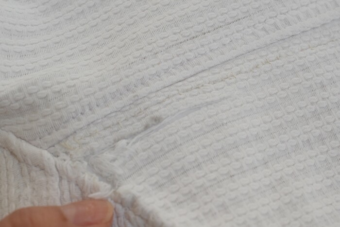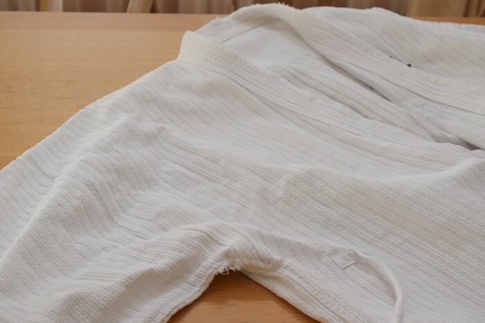 ヨガに行く前に洗濯物を畳んでいたら(お昼には洗濯が乾いた!)、夫の道着の脇の部分が破けていることに気が付きました。