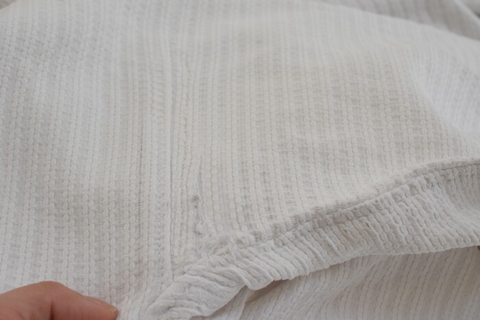 外側(表側)から見るとこんな感じ。ほつれを縫ってもよいのだけれど…