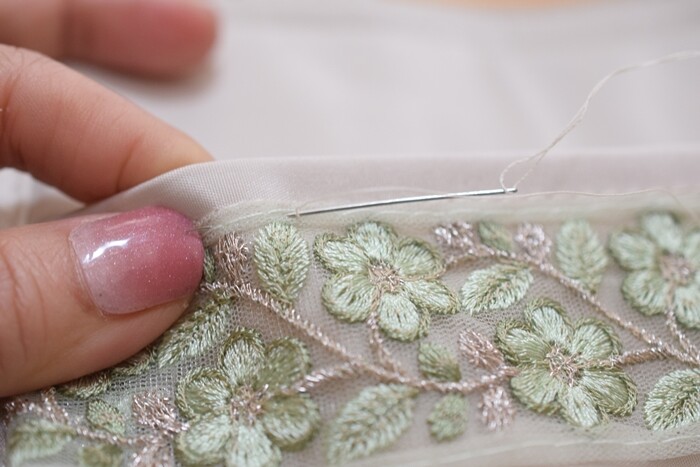 ユザワヤで買ったインド刺繍ブレード(リボン)を付けて~と。