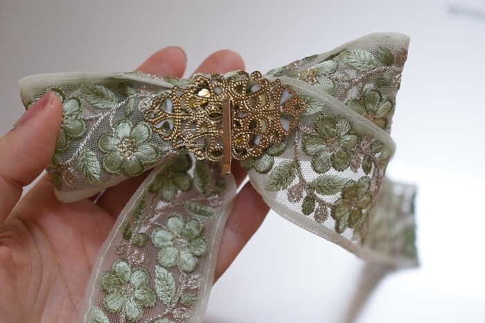 そして残ったインド刺繍ブレード(90㎝買っていたので、70㎝くらい残ったかな)でまたリボンを作って~。家にあった古いポニーフックに縫い付けました。