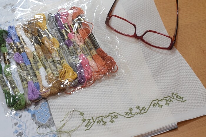 (私が縫い終わったら次にまたサークルの他の方に渡す約束になっています^^私も2色だけ足りなくなった糸を買い足したので、加えて次の方に渡します。)