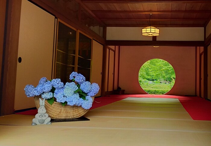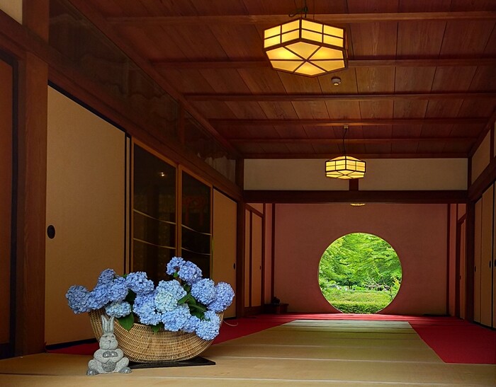 丸窓から見える本堂奥の裏手に広がる庭園が絵画のようで、とても素敵ですよね!