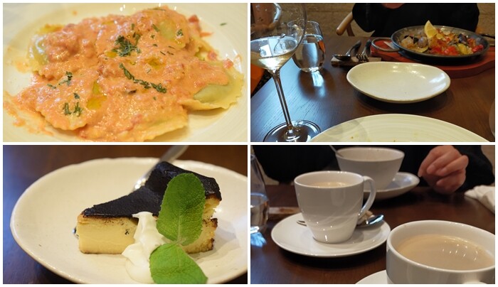 パスタやパエリアもメニューにありましたが、私は「トリュフを詰めたラヴィオリ トマトクリームソース」にしました♬そして、デザートにバスクチーズケーキとコーヒーまで注文して。