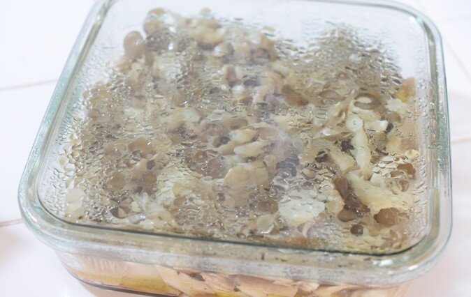 ガラスの耐熱容器に入れて(ずっと昔から使っているiwakiのパック&レンジのセットの中の一番大きなサイズを使いました)。
