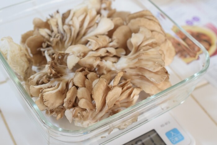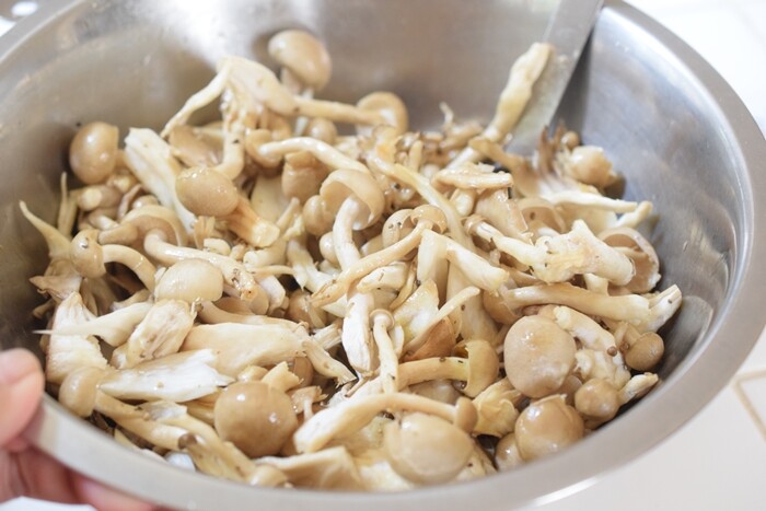 しめじ、エリンギ、マイタケを合わせて500gぐらいほぐして(大量!)。