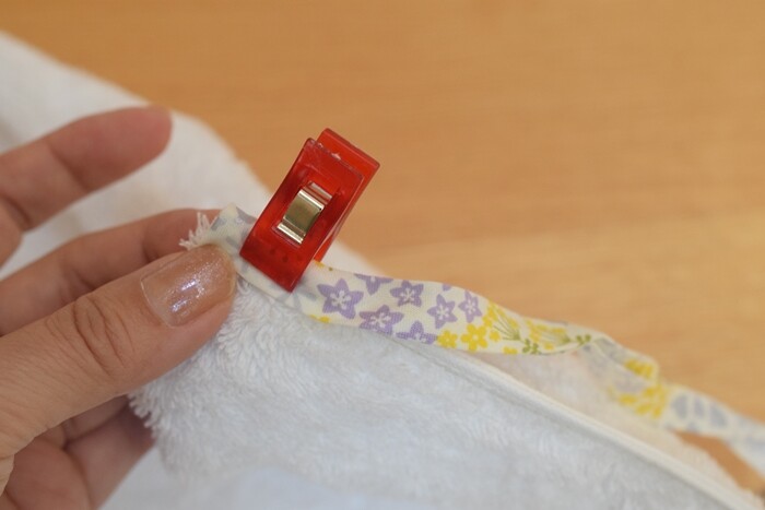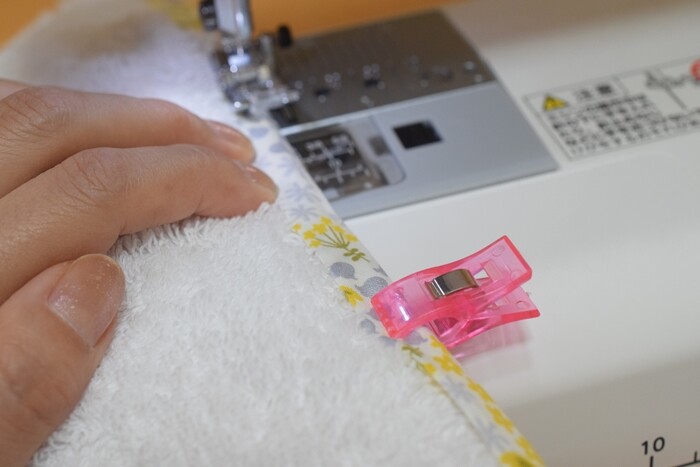 待ち針では止まらないので、クリップで止めました。
