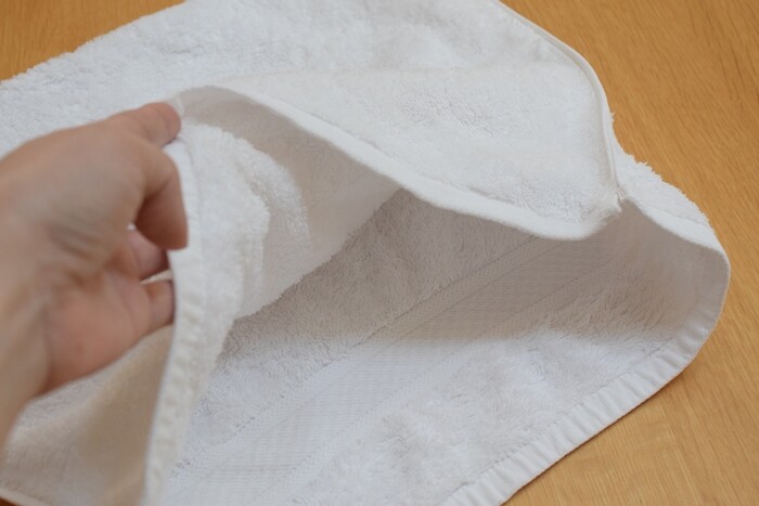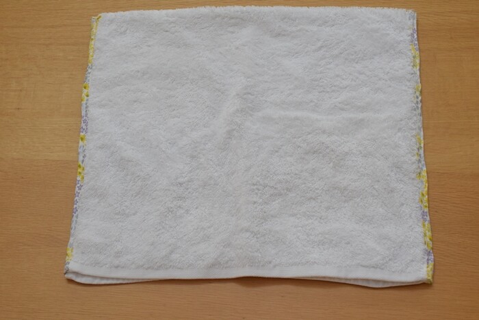 いただきもののタオルなのだけれど、ちょっと形が普通のフェイスタオルと違っていて、中途半端で畳んで重ねにくくて。でも分厚くてしっかりしています。このタオルを使いましょう~