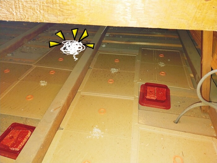 ▼天井裏を確認したり、床下を確認したり…防鼠シートを置いたところを確認。