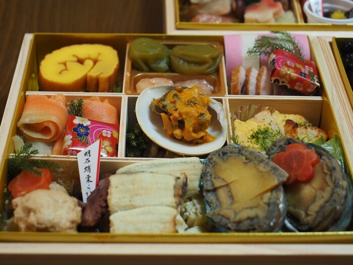 6.5寸のお重に全59品。アワビや海老、蛸、蟹と豪華なおせちでした♬