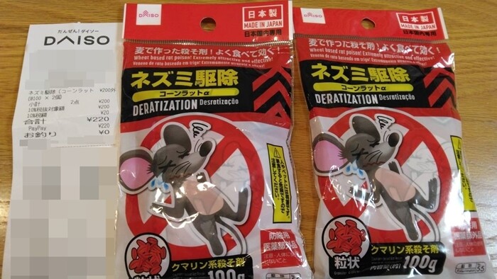 こむぎさんからコメントで教えていただきましたダイソーの殺鼠剤を買ってきまして。