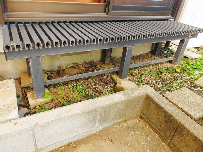 そして和室の南側掃き出し窓の下にはアルミ製の縁台が置かれているのですが、この下にも園芸用の棒がいっぱい入っていて雑草もすごかった。これじゃぁ穴があったって見つけられない。