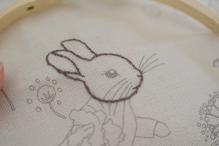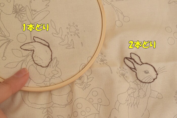 本に作り方が書かれていたのですが、まず輪郭線を1本どりアウトラインステッチで刺すと書かれてて、1本じゃ細そうだな~と、とりあえず2本どりで縫ってみました…やっぱり太いかなぁ。