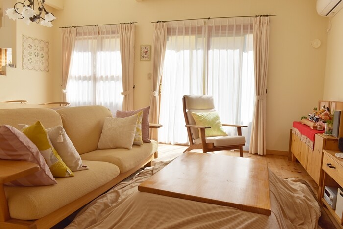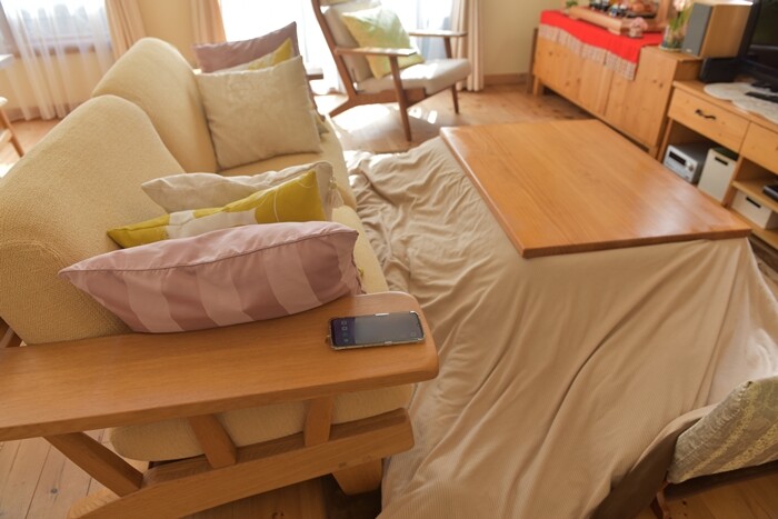 ソファを壁に付けた方が部屋が広く見えますが、この時期はコタツの背もたれとしても使うので、