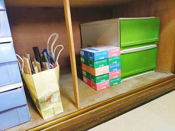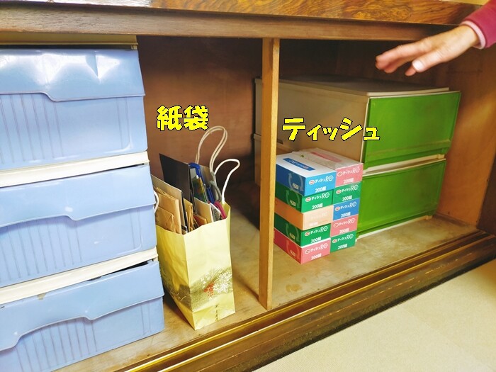 紙袋は1つの紙袋に全部入れて、これ以上増やさないようにと。ティッシュもきちんと置けば、在庫を確認するのも楽ですよね。