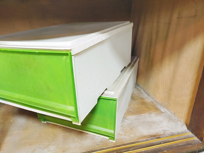 こちらの緑の衣装ケースは父の下着やシャツが入っているそう。母に中身を確認してもらって、古い物やもう着ない物は捨てました。私はケースの外側を全部拭きあげました。(拭いても完全には綺麗にならなかったけども…これももう50年ぐらい使っているものらしいわ。)