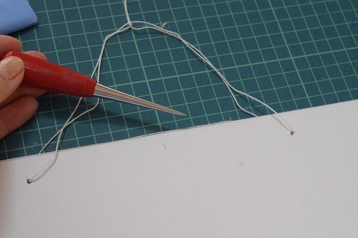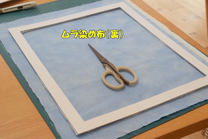 裏板に穴を開けて、吊るための糸を通しました。そして裏板もムラ染め布でくるみまして。