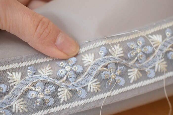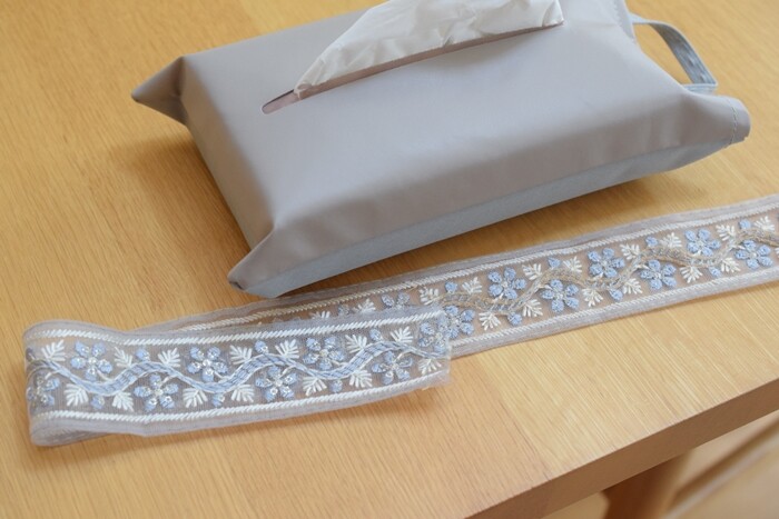ちょうどよい長さだったので、リボンをぐるっとティッシュケースの周りに縫い付けました。ざっくりざっくり。