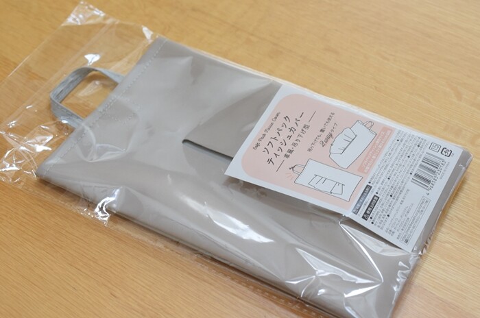 こちらをSeriaで買ってきました。「ソフトパックティッシュカバー(税込み110円)」