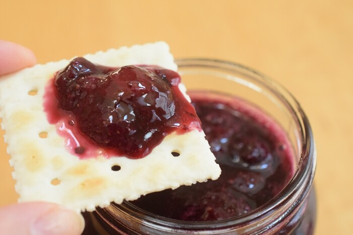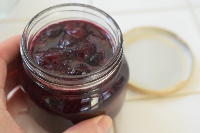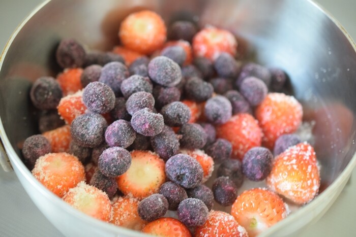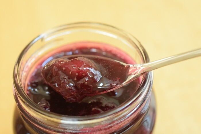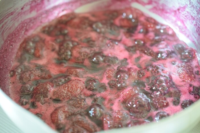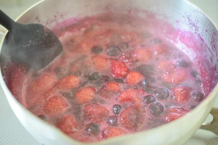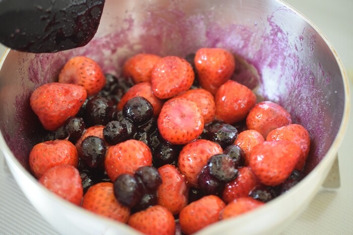 甘さ控えめに作ったけれど(重量比でいうと、イチゴ・ブルーベリーに対して15%くらいの砂糖しか入れていません。)、でも十分甘くて美味しいです。