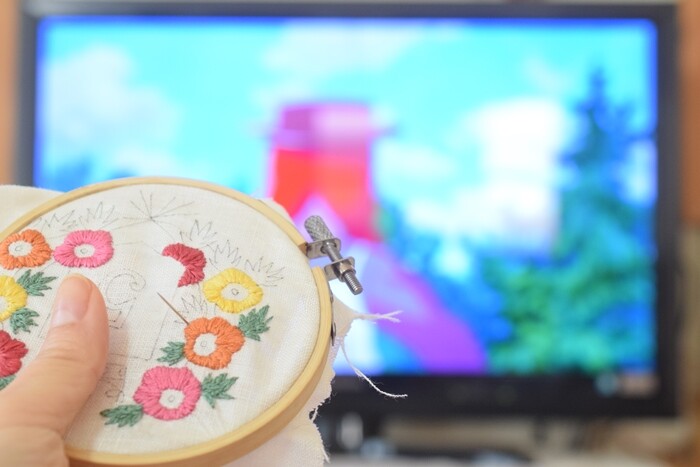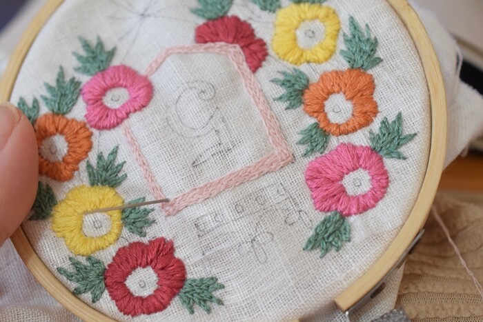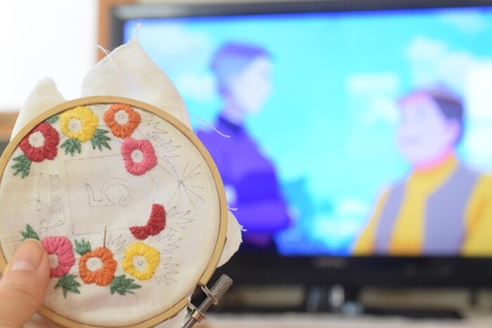 アンを見ながら、5月のエンブレムの刺繍をチクチクと進めています。