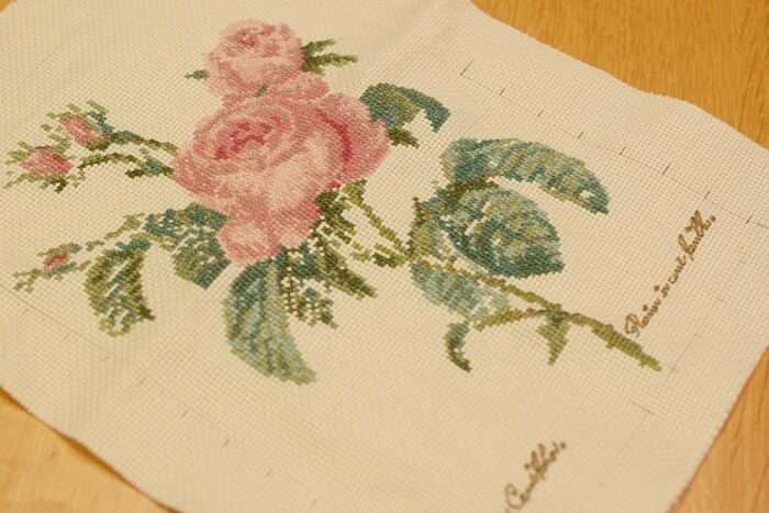 このクロスステッチ、ホビーラホビーレのキットの図案なのですが、「ロサ・ケンティフォリア」という名前のバラだそうですよ~。