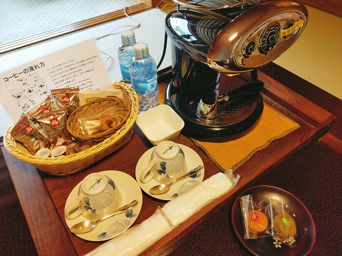 「女子旅プラン」(男性もOKなんですって)にしたところ、特典で部屋にエスプレッソマシンとお菓子が置いてありました♬
