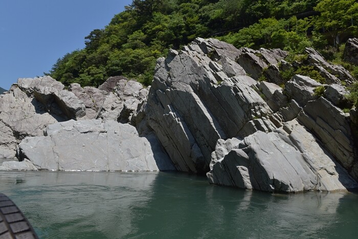 小歩危側に入ると岩の向きが上流側に傾くそうです。