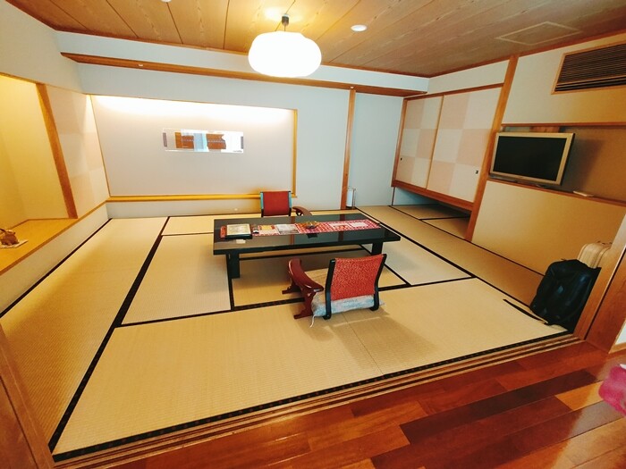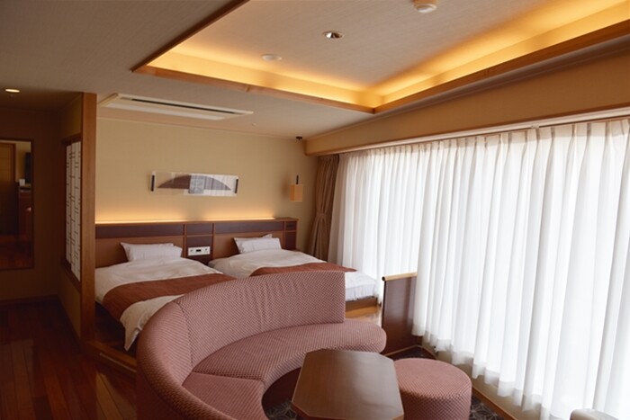 角部屋のスイートルームで和室+ソファ+ベッドルーム+客室露天風呂付。