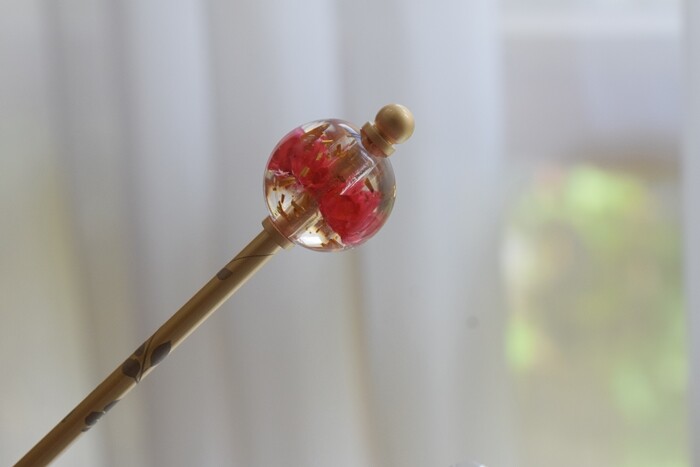 これは樹脂の中にドライフラワーとゴールドのラメが入っています。手作りなので1本1本微妙に色が違っていて、選ぶのも楽しかったわ。一番、色が鮮やかな赤を娘は選んでいました♬