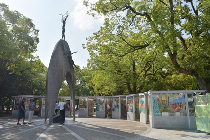 「平和記念公園」内にある「原爆の子の像」で鐘を鳴らしました。