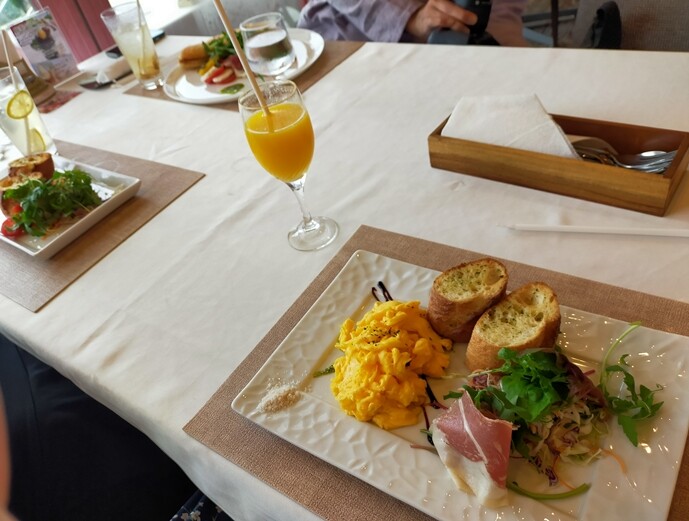 娘は「サラダモーニングセット(¥1,000)」、私は「生ハムのシーザーサラダとスクランブルエッグのモーニングセット(¥1,500)」、夫は「こだわり野菜を使った焼き立てパニーニのオープンサンド(¥2,000)」を頼みました^^