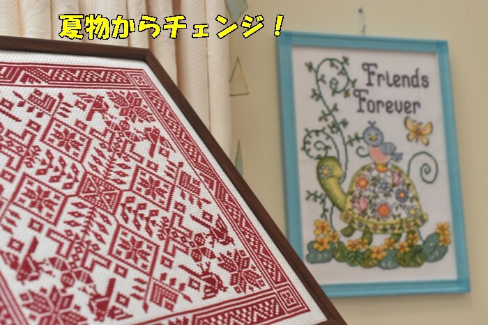 夏にリビングの壁に飾っていたクロスステッチと交換しました。