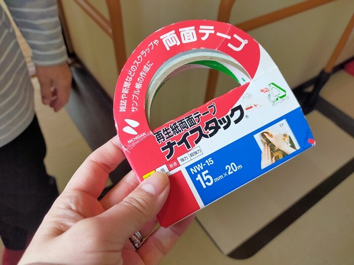 「端がめくれているとつまずきやすいので注意」とコメントをいただいたので(ありがとうございます!)、手すりの土台部分に敷いたタイルカーペットの端を両面テープで固定しました。