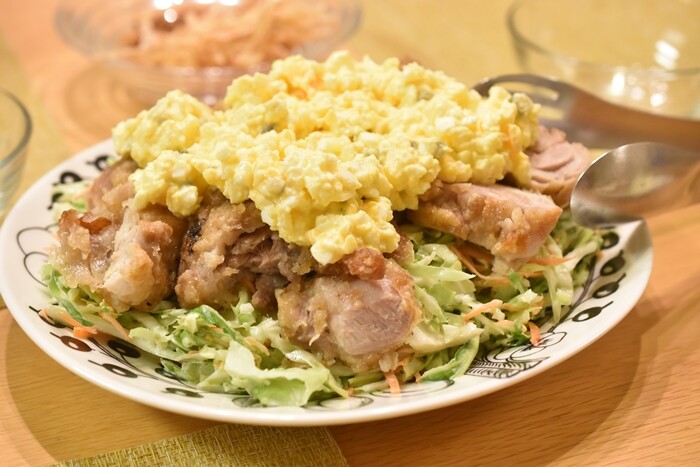 さらにボリュームを出したくて、レンチンしたザンギの上に、