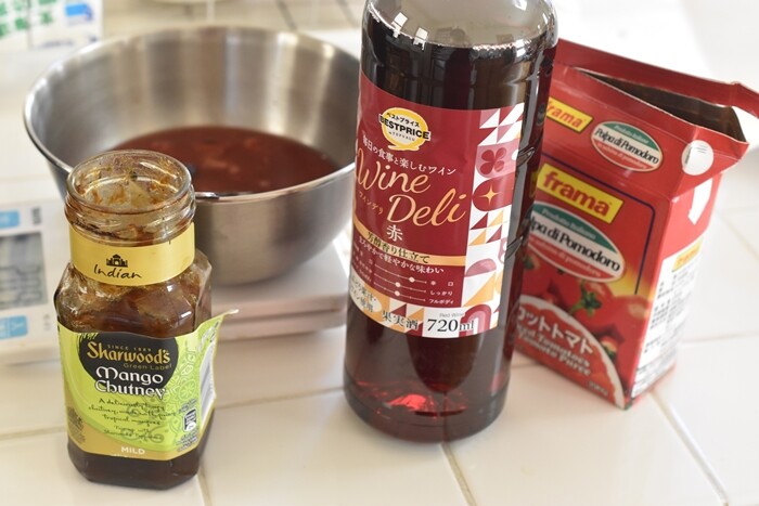 マンゴーチャツネに赤ワイン(料理用の安いやつ^^;)、カットトマト…