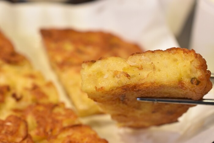 屋台を見てみると、どのお店も同じくらいの分厚さで、油で揚げ焼きしているんですよ。