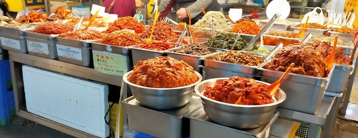 キムチ屋さんやお魚屋さん(日本と同じような感じ)、お惣菜のお店、生地屋さん(ヌビバッグがたくさん!)などが並んでいて、見ているだけでも楽しかったです♬