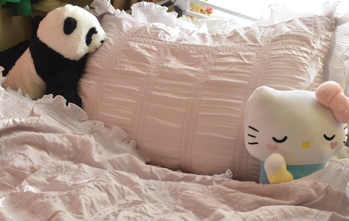 ▼韓国ダイソーで買ったキティちゃんをベッドに寝かせています(笑)