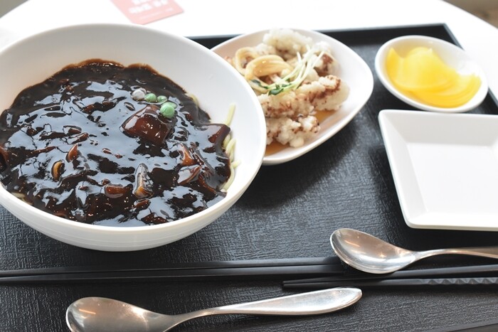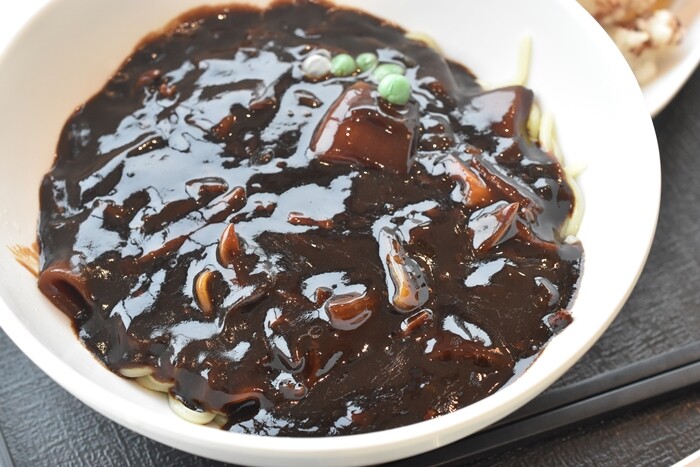 ジャジャンミョンは、豚肉やタマネギなどを黒味噌で炒め、片栗粉でとろみをつけたソースが麺にかかっているもの。