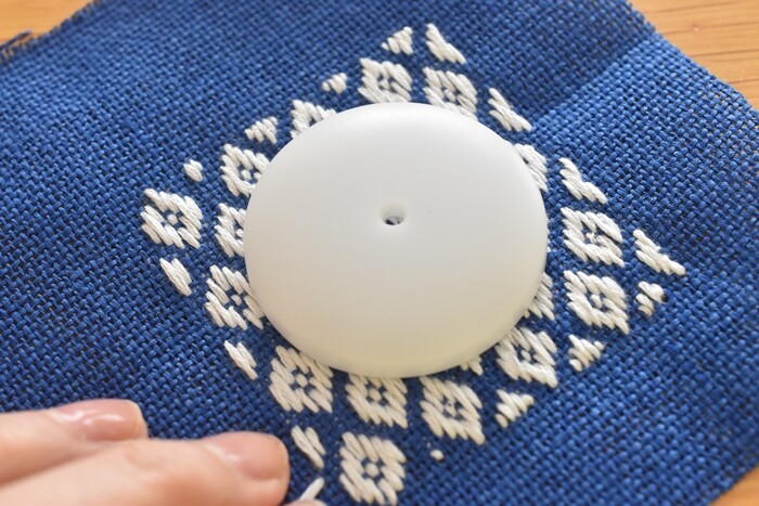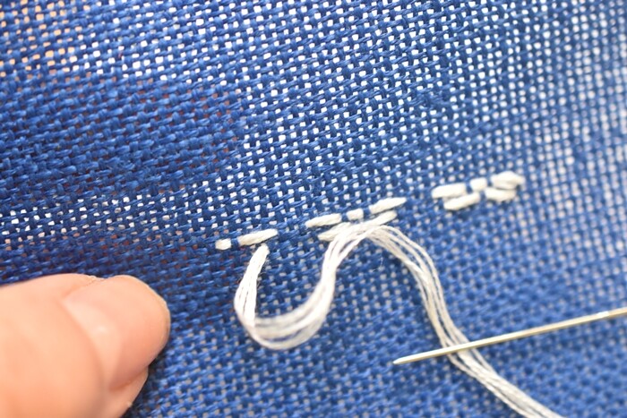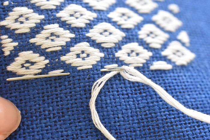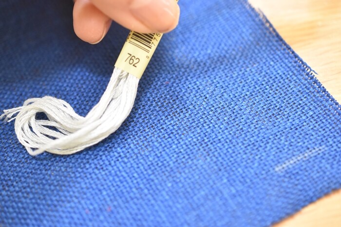 針もクロスステッチ用の先が丸まった針を使いました。(こぎん用のも売られているけれどわざわざ買わず)青の生地にはちょっとグレーがかった白の762番にしました。