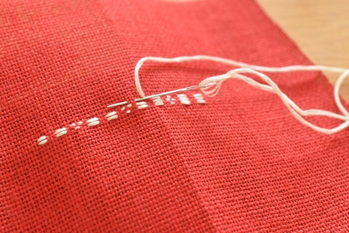 普通の刺繍のように一つ一つの模様を縫うのではなく、横一列をずーっと糸をまっすぐ渡して縫って、次の段に移るように縫います。糸が太いのもあって、布にしっかりと厚みが出る感じ。確かに補強になると思うわ。
