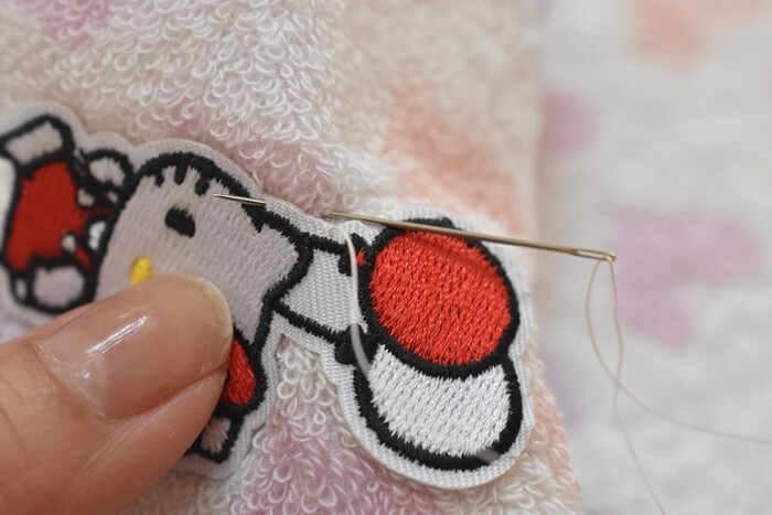 アイロンだけでわりとしっかり貼り付いているのですが、ハンカチは洗濯回数が多くなりそうなので、念のため周囲をざっくりまつり縫いしておきました。本当に簡単に縫い留めただけです。