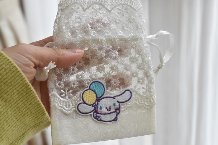 さらに、どこかでいただいたレースのミニ巾着にもワッペンを貼ってみたら、とっても可愛くなりました!