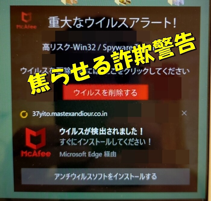 本物のセキュリティソフトを装って不安をあおり、クリックさせたり、ソフトを購入させたりする詐欺らしいです。