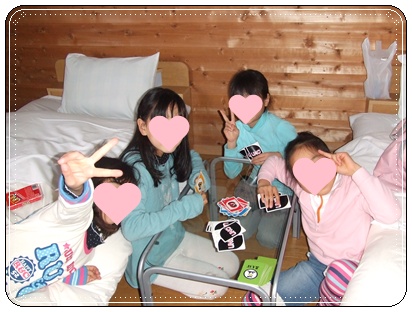 母部屋・父部屋・女の子部屋・男の子部屋なんて感じで家族ばらばらな部屋でしたが、子供たちはそれぞれの部屋で内緒話をしたり、肝試ししたり、ウノしたり、楽しんでいたようです。ぷぷぷ。
